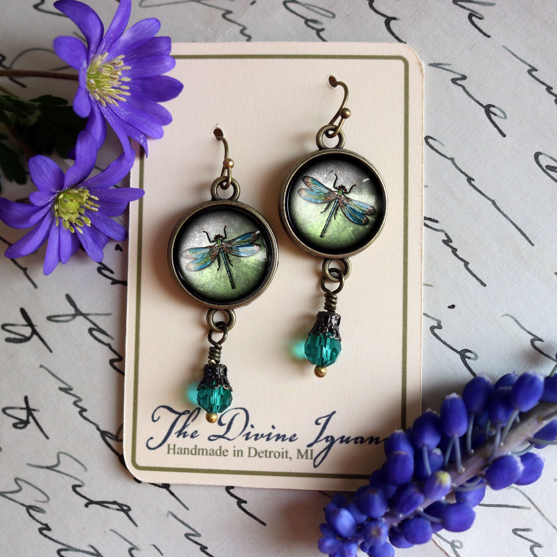 Dragonfly Vintage Inspired Glass Cabochon Earrings